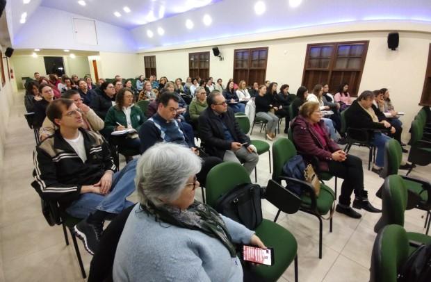 Mais de 60 pessoas estiveram no auditório da Paróquia Sagrado Coração de Jesus, em Antônio Prado, na noite da quarta-feira, 21 de setembro, para participar da sétima etapa da Escola Catequética promovida pela Comissão de Iniciação à Vida Cristã da Diocese de Caxias do Sul. Neste ano, as tradicionais noites de formação ganharam, um novo formato. A partir das experiências oferecidas pela pandemia do Covid-19, que permitiu a realização de formações em formato online, em 2022 os encontros são híbridos e contemplam as sete Regiões de Pastoral da Diocese.