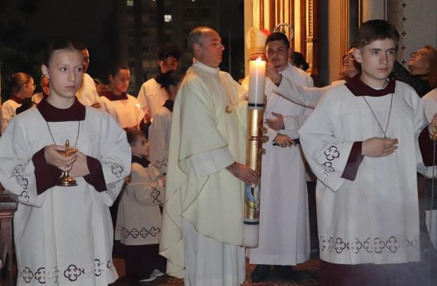 Logo depois foi proclamada a Páscoa com o canto do Exultet, seguido da Liturgia da Palavra. Após o Evangelho e a homilia aconteceu a bênção da água, a renovação das promessas do Batismo e a aspersão sobre os fiéis. Com a Liturgia Eucarística, o povo de Deus deu graças ao Senhor por esta Páscoa. A Missa foi concelebrada pelo pároco da Catedral, padre Volnei Junior Vanassi, tendo como cerimoniário o padre Tiago Camozzato.
