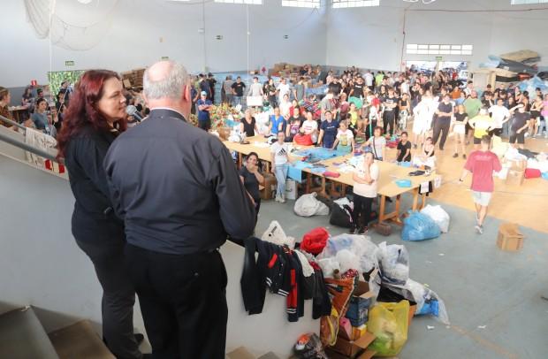 Na tarde desta terça-feira, 07 de maio, o bispo diocesano de Caxias do Sul, Dom José Gislon, visitou o centro de operações e triagem de doações para os atingidos pelas chuvas e enchentes, no ginásio de esportes do Seminário Diocesano Nossa Senhora Aparecida, no bairro Nossa Senhora da Saúde, em Caxias. Desde a quinta-feira, 02 de maio, em parceria com a Fundação Caxias e com o poder público, a Igreja Católica cede o espaço e ajuda, com voluntários, na organização das doações.