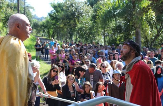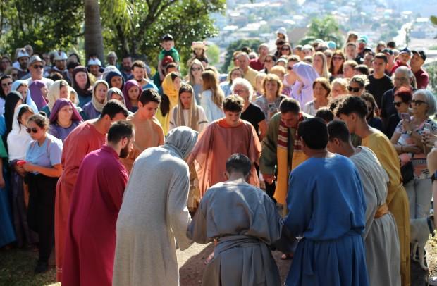 Cerca de 30 jovens vão encenar a paixão e morte de Jesus, às 09h, nos Pavilhões da Festa da Uva; a representação seguirá percorrendo as estações da Via-Sacra, que iniciam na condenação de Jesus até a sua morte na cruz e sepultamento