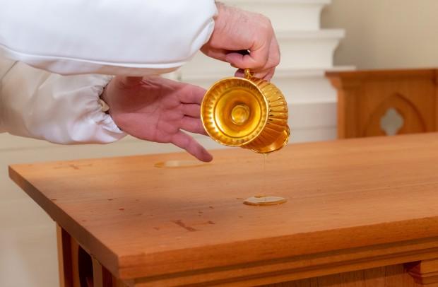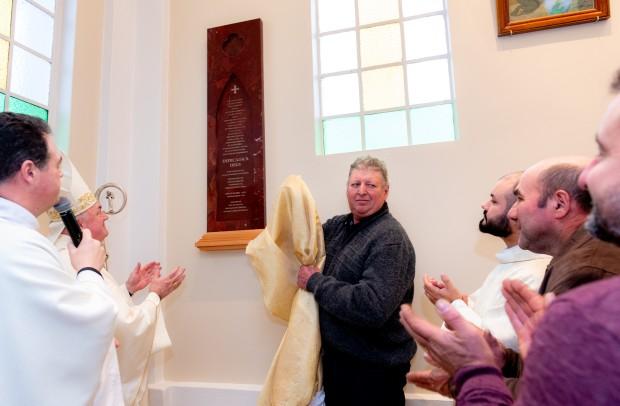 As cruzes nas paredes da igreja também foram ungidas, simbolizando a consagração total da pequena igreja ao serviço divino.