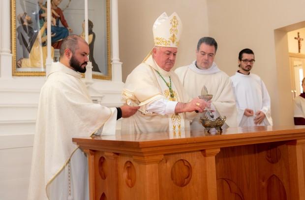 Após a Ladainha de todos os Santos, Dom José depositou relíquias de santos mártires e do primeiro Beato da Diocese de Caxias do Sul, o padre João Schiavo, na pedra fixada ao altar
