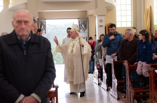 Dom José Gislon iniciou a celebração destacando a importância deste momento para a comunidade católica local. "Estamos aqui, meus irmãos e minhas irmãs, para dedicar solenemente este templo." Após a Ladainha de todos os Santos, Dom José depositou relíquias de santos mártires e do primeiro Beato da Diocese de Caxias do Sul, o padre João Schiavo, na pedra fixada ao altar. A celebração marcada por diversos ritos, teve a unção do altar com óleo do Crisma, realizada pelo bispo.