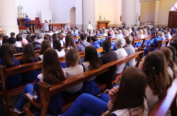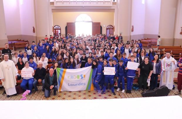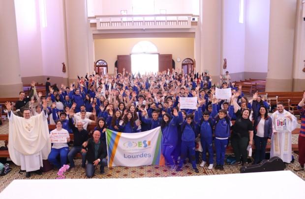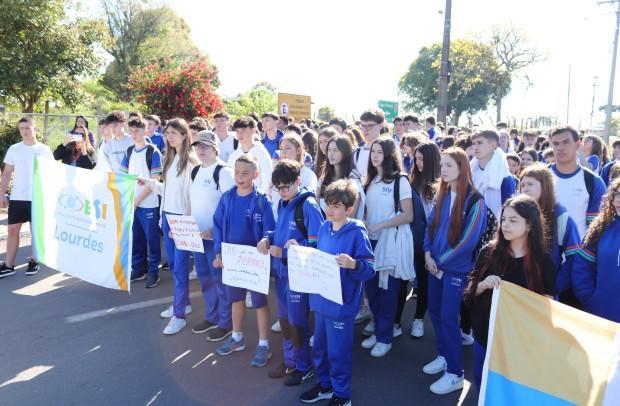 Estudantes do Colégio Scalabriniano Nossa Senhora de Lourdes e da Escola Municipal Nossa Senhora de Caravaggio participaram do encontro, que iniciou com a caminhada pela avenida Dom José Barea e teve como ponto alto da Missa no Santuário