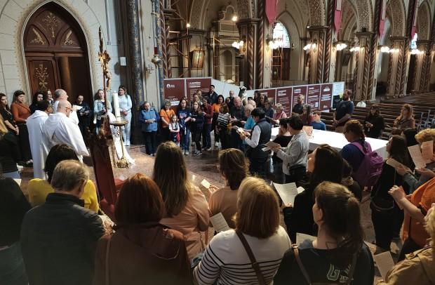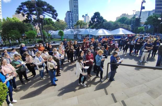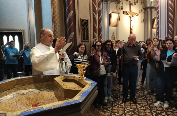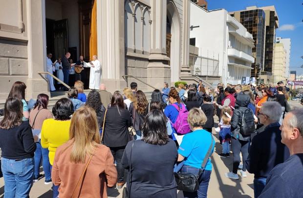 Mobilizados pela Comissão de Educação e Cultura da Diocese de Caxias do Sul, participantes iniciaram na escadaria da Igreja-Mãe da Diocese, passaram pela porta, renovaram as promessas do Batismo e rezaram nas intenções do Santo Padre