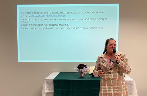 A Coordenadora Diocesana da Iniciação à Vida Cristã, Margareth Bedin Menegat, deu sequência na formação com abordagem para a metodologia catequética, e destaque para a organização dos encontros e propostas pedagógicas