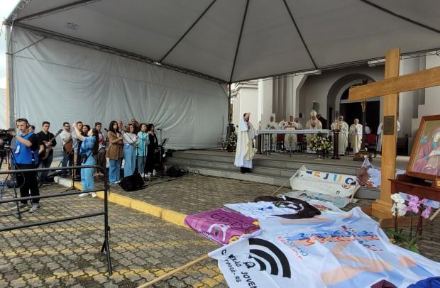 Trazendo suas bandeiras e vestindo as camisetas dos grupos e movimentos, os jovens participaram da celebração Eucarística na Casa da Mãe. A Missa campal teve a liturgia e cantos organizados pela juventude e foi presidida pelo bispo diocesano de Caxias do Sul, Dom José Gislon. Concelebraram, o bispo emérito, Dom Alessandro Ruffinoni, o reitor do Santuário de Caravaggio, padre Ricardo Fontana, além do assessor do Setor Juventude, padre Gustavo Predebon, e demais padres da Diocese de Caxias do Sul.
