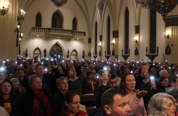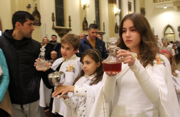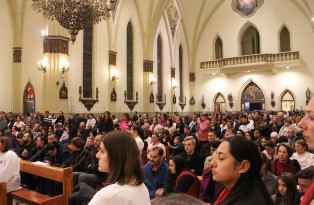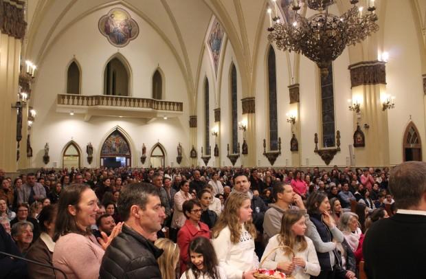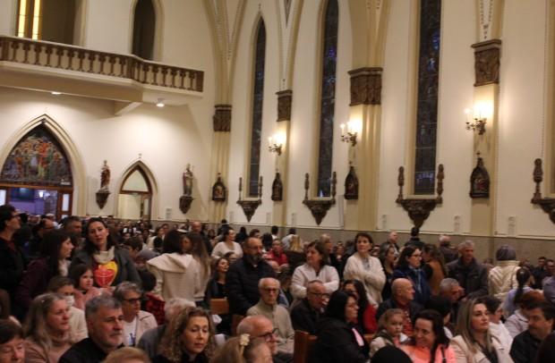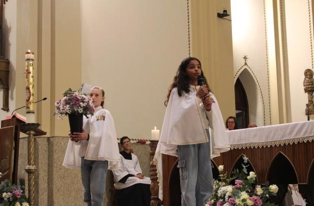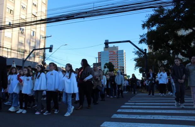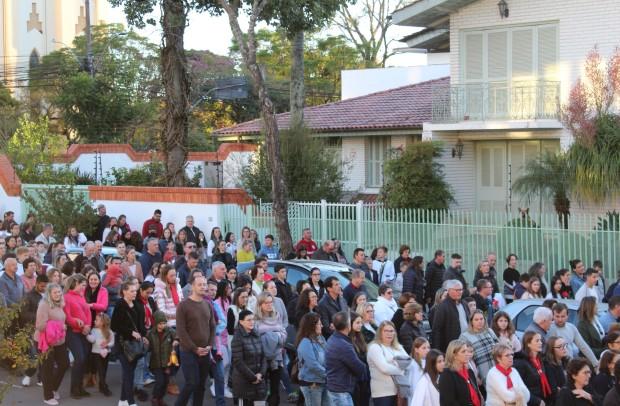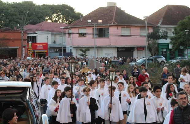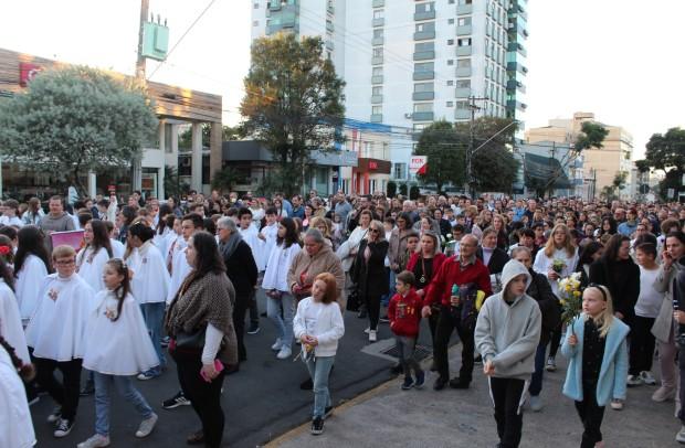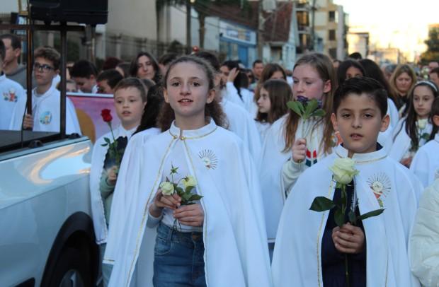 A récita do Terço aconteceu durante a procissão com a imagem de Nossa Senhora de Fátima, que mobilizou centenas de pessoas. O momento de oração foi coordenado pela da Pastoral Vocacional da Diocese de Caxias do Sul e contou com a participação das famílias da Catequese e dos catequizandos.