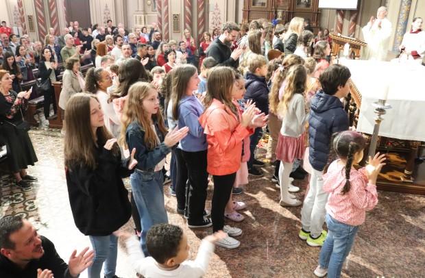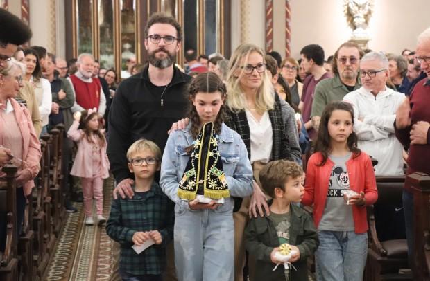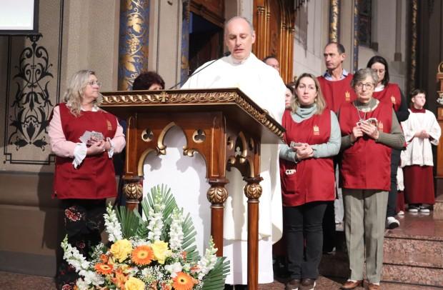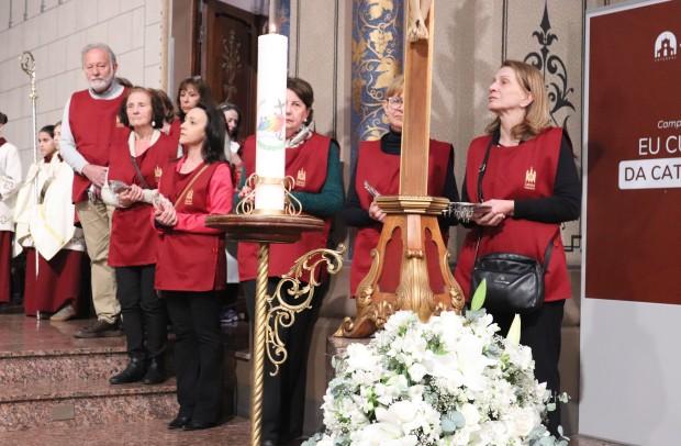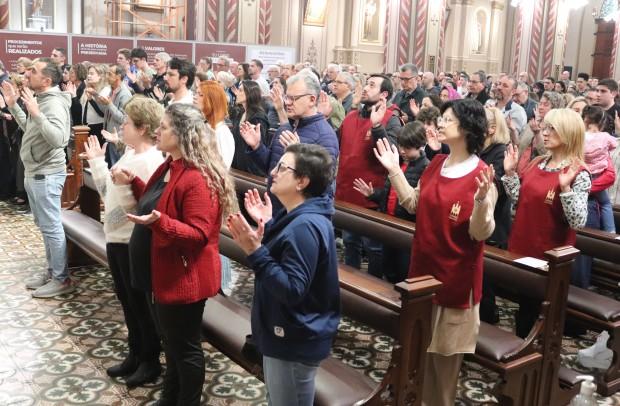 Antes do início da celebração, com a Catedral na penumbra e uma luz focando a imagem de Santa Teresa, foi recitado um poema de sua autoria no qual ela fala sobre a cruz como estandarte da vitória da vida sobre a morte. Logo depois, a procissão de entrada teve a participação de leigos que atuam nos serviços e pastorais que levaram até o presbitério a Cruz do Jubileu de 2025. Atrás, a imagem da Padroeira de Caxias do Sul conduziu os fiéis à oração enquanto toda a comunidade se unia cantando com o Coral Santa Teresa.