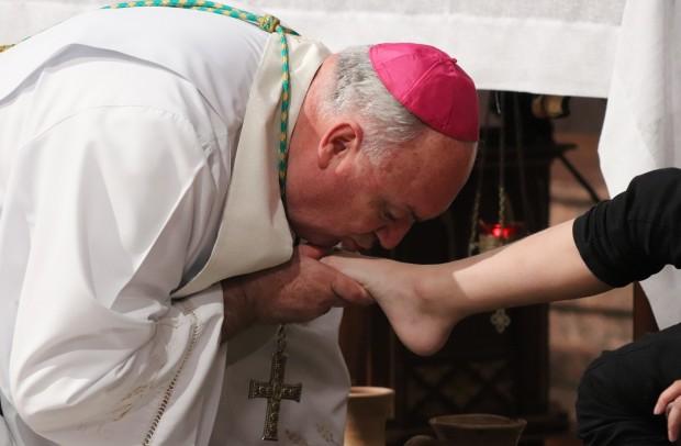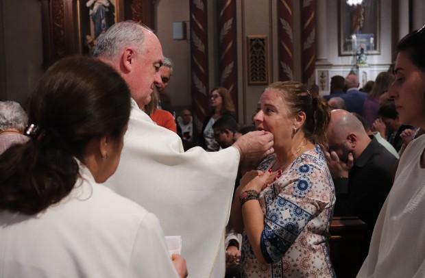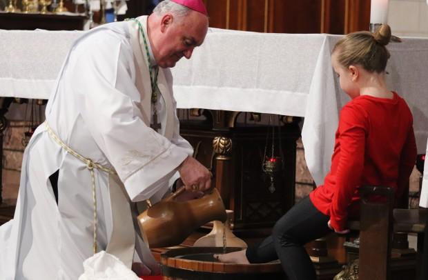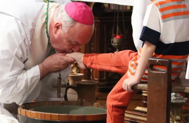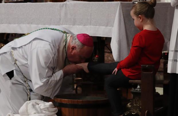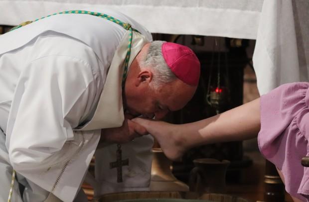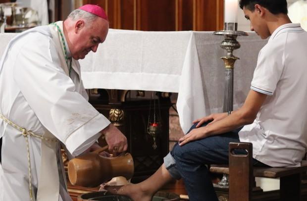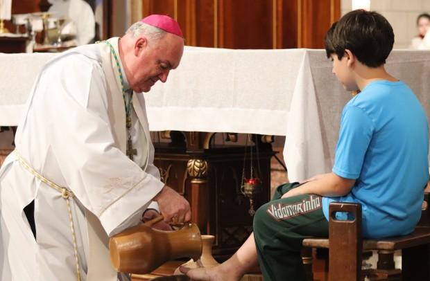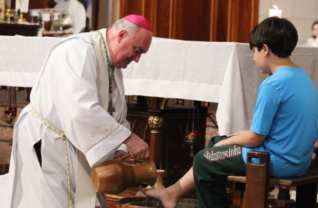 O rito do lava-pés teve pessoas de diversas idades, desde uma gestante até um homem de 33 anos, recordando a defesa e da criação; ao final, depois da transladação do Santíssimo, os catequizandos depositaram flores diante do sacrário