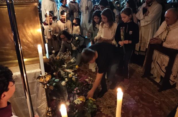 As crianças e famílias da Catequese fizeram um belo gesto: levaram flores aos pés do Sacrário que guarda o Santíssimo após a sua transladação, no Espaço Mater Dei. "Deixemo-nos interrogar pelos gestos de Jesus, tão distantes, mas tão próximos de nós, homens e mulheres do Terceiro Milênio, para podermos entender o que Ele fez por nós", salientou Dom José.