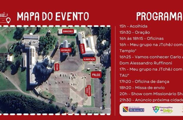 O evento tem previsão de conclusão para às 22h, sendo que na programação estão momentos de oração, oficinas e apresentações culturais dos grupos de jovens da Diocese de Caxias do Sul. O momento central da JTchêJ será a celebração da Missa, em frente ao Santuário, marcada para às 18h20min. Logo depois, no palco montado junto ao estacionamento, acontecerá o show nacional com a banda Missionário Shalom, formada por jovens membros da Comunidade Shalom de Fortaleza, no Ceará. No encerramento será feito o anúncio da cidade que irá sediar a JTchêJ em 2024.