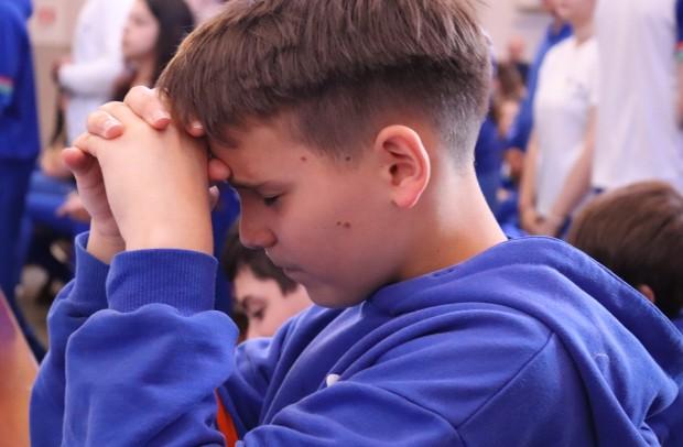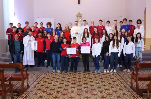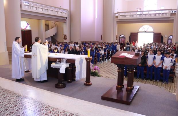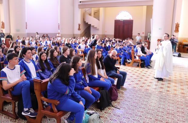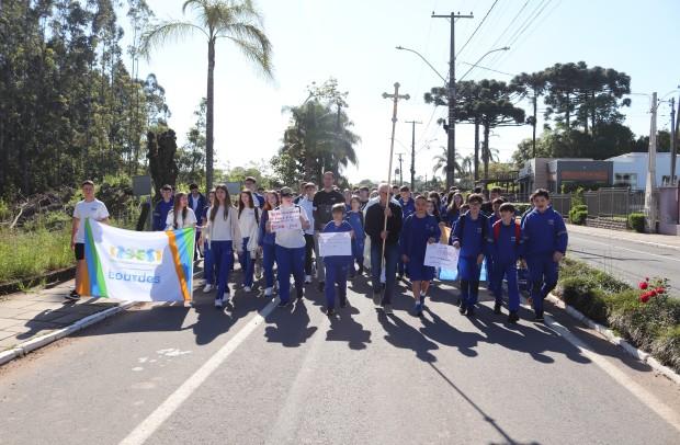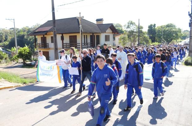 Estudantes do Colégio Scalabriniano Nossa Senhora de Lourdes e da Escola Municipal Nossa Senhora de Caravaggio participaram do encontro, que iniciou com a caminhada pela avenida Dom José Barea e teve como ponto alto da Missa no Santuário